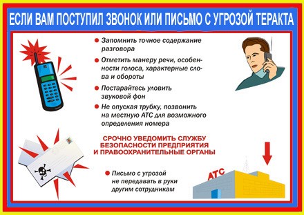Учитывая, что в настоящее время телефон часто используется для сообщения сведений, содержащих информацию о заложенных взрывных устройствах, о захвате людей в заложники, вымогательстве и шантаже, не оставляйте без внимания ни одного подобного сигнала!