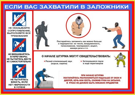 - сохраняйте выдержку и самообладание, не возражайте и не пререкайтесь с террористами, на все действия спрашивайте разрешения у террористов;